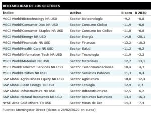 Como llevamos comentando 2 semanas, es buen momento para pararnos y analizar nuestra cartera y ajustarla de cara al año. De manera táctica (no estratégica), podemos adaptar nuestra cartera con la intención de proteger la misma, teniendo en cuenta los sectores más penalizados y los más protegidos frente al impacto del COVID-19.