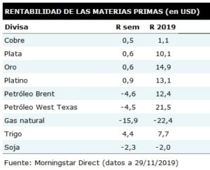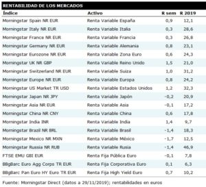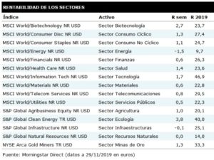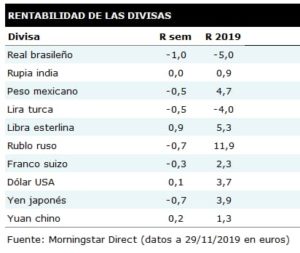 De esta forma, las bolsas alargaron su avance una semana más, volviendo a marcar máximos en Wall Street. Por otro lado, el apoyo de EE.UU. a las protestas en Hong Kong no gusta a China y provocará, previsiblemente, un retraso en la concreción de la fase uno del acuerdo comercial. No obstante, a corto plazo, la clave sigue siendo que EE.UU. no aplique la subida arancelaria prevista para el próximo 15